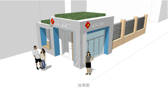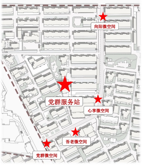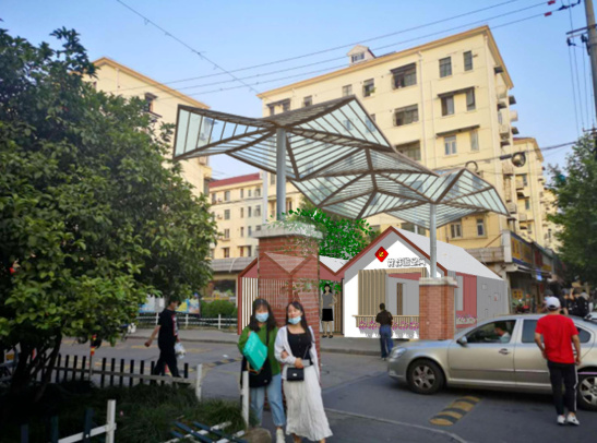 改造計劃將國定支路菜市場西側現有大棚進行加固,改造成為黨群服務驛站,融入黨建宣傳、黨員教育、便民服務、學生自習等功能。沿街四處零星建筑分別為“吾老微空間”、“心享微空間”、“向陽微空間”和“黨群微空間”,并根據其地理位置特點,分別以適老助老服務、睦鄰休憩談心、鄰里資源共享和黨史學習教育宣傳為功能定位,為周邊居民鄰里互動、日常學習、休憩閱讀提供一個溫暖、溫馨、溫情的家園。