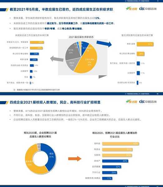 四成企業2021屆校招人數增加,民企、高科技行業擴招明顯。整體來看,41%的企業2021屆高校生招聘人數相比去年增加,55%的企業需求持平。不同行業中,高科技、制造、互聯網行業人數增加的企業比例較高,超半數企業校招人數增加。