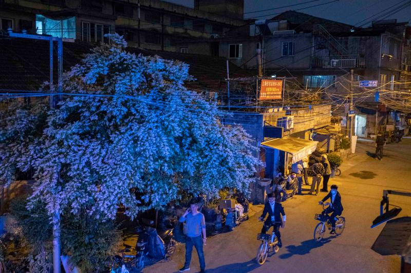 夜幕降臨的舊改基地,一棵苦楝樹上的花開得正盛。 本文圖片均 賴鑫琳 攝