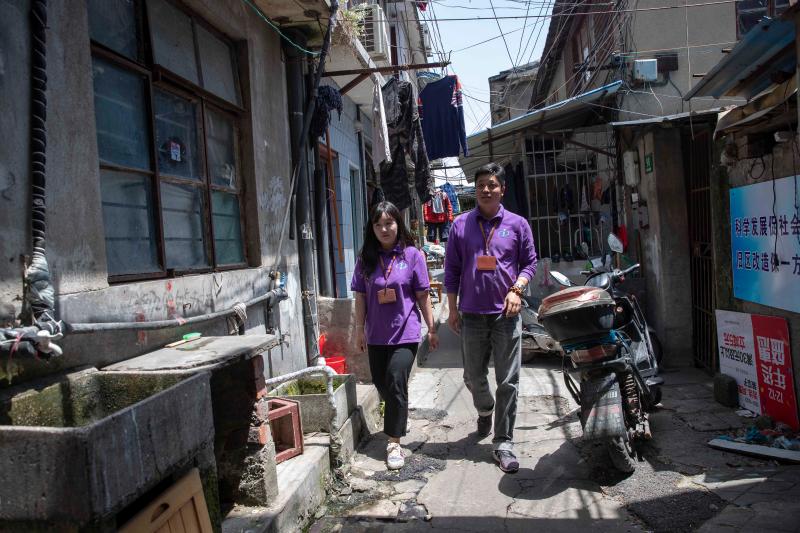 劉亮亮(右一)剛到居民區上任一個半月,每天不分晝夜地走訪,他走過居民家中最狹窄的樓梯,見過最黑暗的角落。