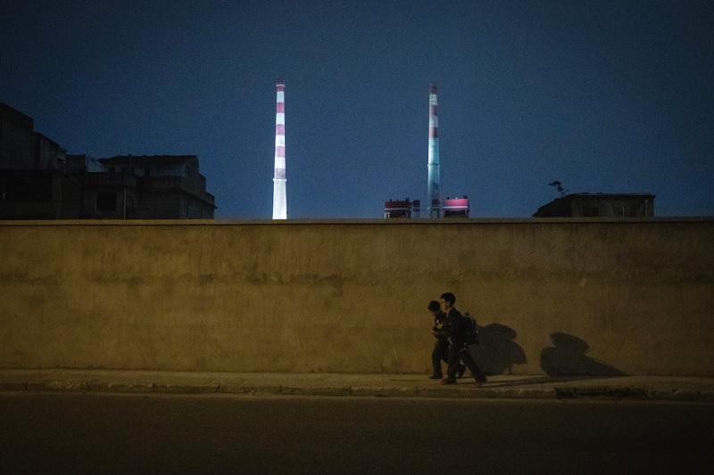 入夜,不遠處楊樹浦發電廠的兩只大煙囪亮起了燈光,在舊改基地的成片房頂和已拆遷地塊的廢墟上投下巨大的身影。