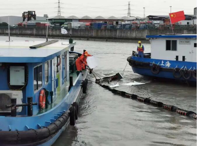 隨后,演練模擬了水域內突發船只著火,并出現大量油污污染水面,船員緊急開展自救,一邊用防火器具滅火,一邊通知寶山執法水面油污情況,寶山執法當即安排東安公司的污油處置船前往現場,對溢油進行圍控并拋放吸油氈吸油,直至油污清除。