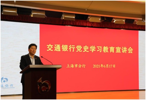 6月16-17日,交通銀行黨委黨史學習教育第三指導組(宣講團)至交行上海市分行開展專題宣講,會議由交通銀行上海市分行黨委書記、行長徐斌同志主持,黨委班子成員出席會議,全行450名黨員代表、群眾代表、離退休職工代表等分別以現場和視頻的方式參會。