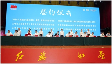 上海市人大常委會主任蔣卓慶、福建省人民政府省長王寧,福建省委常委、政法委書記羅東川,福建省人民政府副省長鄭建閩、上海市文旅局局長方世忠、福建省文旅廳廳長吳賢德等領導共同見證兩。ㄊ校┪穆貌块T簽訂合作協議,三明市政府分別與上海文化產權交易所、錦江國際(集團)、上海航空國際旅游(集團)三家上海市代表企業簽定戰略合作協議。
