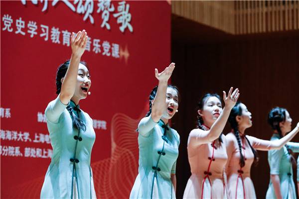 當晚的“‘百年征程奏華章,時代新人頌贊歌’上海高校、教委直屬單位基層黨組織黨史學習教育暨音樂黨課”音樂會,在震撼人心的民族鼓樂合奏《龍騰虎躍》開場后,從“音樂黨課”的角度,分成了三大樂章。第一樂章是《崢嶸歲月 砥礪前行》,用一些紅軍在解放戰爭時期的音樂經典作品串聯,其中包括了阿卡貝拉演唱《映山紅》、男聲六重唱《游擊隊之歌》、女聲重唱與舞蹈《絨花》等;第二樂章是《立邦興國 美麗家園》,主題是愛國情懷,選擇的是歌唱祖國大好河山的作品,包括古箏二重奏《瀏陽河》、女聲二重唱《卜算子·詠梅》、師生重唱《春天的芭蕾》;第三樂章是《不忘初心 筑夢復興》,以共筑中國夢為主題,選擇了女聲二重唱《我愛你,中國》、混聲合唱《南泥灣》《在燦爛陽光下》等作品。
