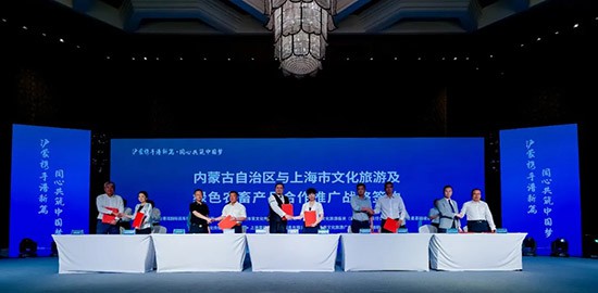為促進滬蒙兩地在文化旅游及綠色農牧產業在更寬領域、更深層次、更廣范圍的合作,活動現場,內蒙古自治區文化和旅游廳與上海市文化和旅游局、內蒙古自治區農牧廳與上海市農業農村委員會、內蒙古自治區商務廳與上海市商務委員會、內蒙古自治區工商業聯合會與上海市工商業聯合會分別進行了戰略合作簽約。同時,兩地26家文旅企業、農牧企業也分別進行了項目簽約。