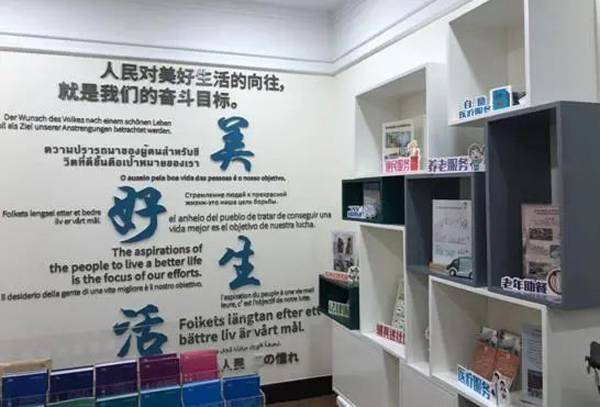 在虹橋街道古北市民中心一樓的墻面上,用13種文字書寫“人民對美好生活的向往,就是我們的奮斗目標”。人民網記者 羅旭攝