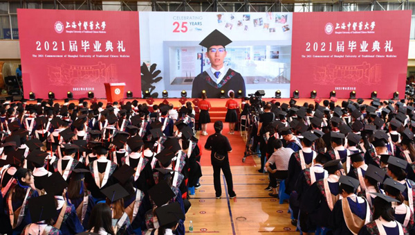 當天上午,上海中醫藥大學2021屆畢業典禮在校體育館舉行。學校黨委書記曹錫康,校黨委副書記、校長徐建光等學校領導,校學術委員會主任、中國科學院院士陳凱先,中國科學院院士林國強及校學術委員會委員代表等共聚一堂,送別1774位本?粕、研究生。今年典禮還特邀18位2020屆畢業生代表“回家”共同參與。