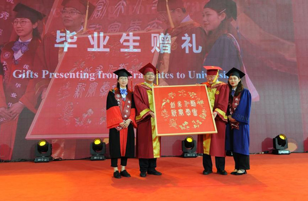 臨別之際,畢業生代表通過向教師獻花、向母校贈禮的形式寄托對母校的深深眷戀及感恩之情。這次畢業生贈予母校的禮物是一幅由畢業生代表歷時兩個多月,一針一線所完成的刺繡作品——《錦繡前程》。作品中央是“勤奮、仁愛、求實、創新”的校訓,外圍是一圈百草紋樣的“錦繡”。