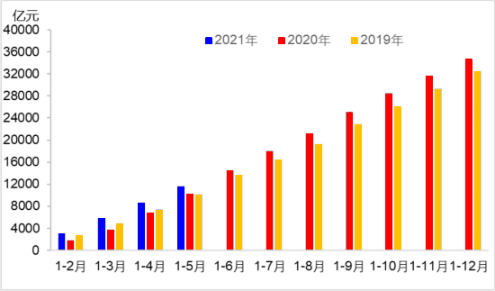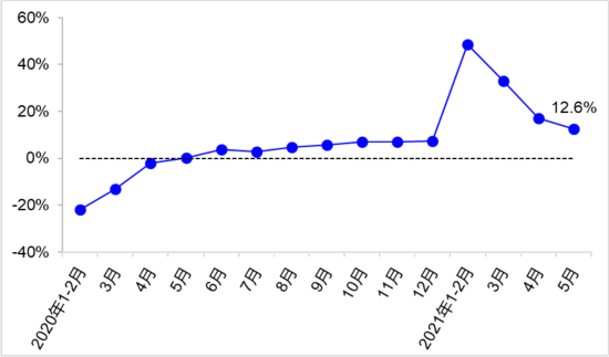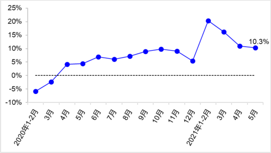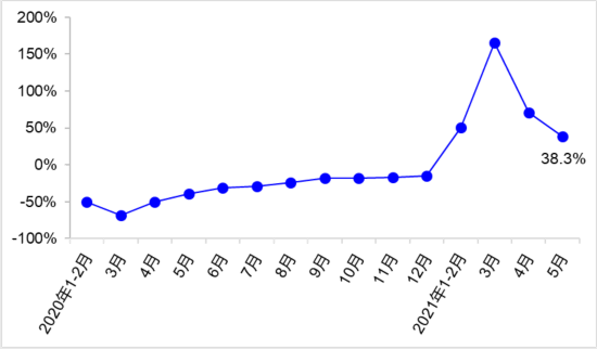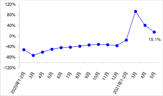 5月,完成營業性貨運量45.8億噸,比2020年同期增長12.6%,比2019年同期增長13.0%。其中,完成公路貨運量34.8億噸,比2020年同期增長14.4%;完成水路貨運量7.0億噸,比2020年同期增長5.9%。