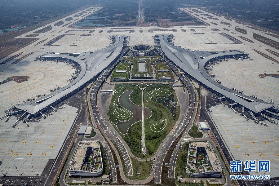 成都天府國際機場位于成都簡陽市,地處成都市東南方向,距離成都市中心天府廣場和成都雙流國際機場各約50公里。一期工程概算總投資超過750億元,飛行區等級為4F,已建成“兩縱一橫”3條跑道和71萬平方米的兩座航站樓,241個停機位及相應設施,將滿足年旅客吞吐量6000萬人次、貨郵吞吐量130萬噸的需求。遠期規劃將建成“四縱兩橫”6條跑道,140萬平方米航站樓,滿足年旅客吞吐量1.2億人次、貨郵吞吐量280萬噸的需求。