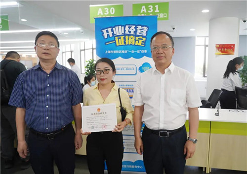 6月25日下午,在普陀區行政服務中心“一業一證”窗口,隨著工作人員敲下紅色印章,上海泉源堂智慧藥房有限公司負責人劉曉琴從區府辦(區政務服務辦)、區市場監管局負責人手中接過尾號為“001”號的行業綜合許可證,這是普陀區推進“一業一證”改革以來頒出的首張證件。劉曉琴激動地表示,“沒想到申請后才10多天就拿到了證件,還是普陀區首張證件,真是太榮幸啦!我們充分感受到了在普陀辦事的快捷便利!”