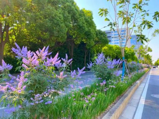 該花道位于浦東張江鎮盛夏路(銀冬路-祖沖之路段),為2020年改造提升道路,長度約500米。該道路主要打造藍色系夏季開花植物。中層6月中下旬開花的穗花牡荊,下層為6月中下旬開花的紫嬌花。通過施肥、修剪等精細化養管措施,開花成效顯著。