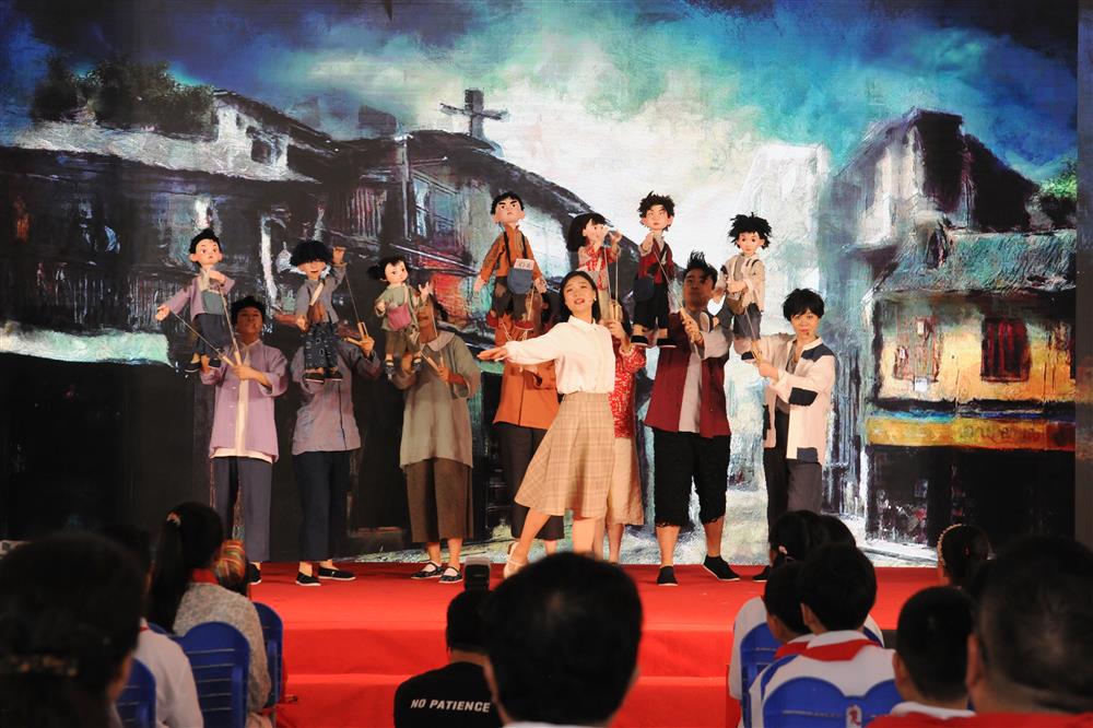 6月28日,上海市黃浦區報童小學校園中響起經典傳唱的《賣報歌》,演唱者是一群特殊“來賓”——上海木偶劇團精心制作的“木偶小報童”。此次活動是劇團受報童小學邀請,參加“童心向黨話傳承,共講同繪復興路”課本中的紅色故事閉幕活動,而這首大眾耳熟能詳的歌曲,也成為上海木偶劇團2021年打造的海派木偶音樂劇《報童之聲》中的一首。