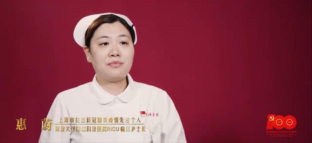 上海市抗擊新冠肺炎疫情先進個人、同濟大學附屬同濟醫院RICU病區護士長惠蔚:“去年除夕夜,我作為上海首批馳援武漢136名醫務人員的一員,感到十分光榮。我的人生信仰是——‘永遠跟黨走’,我在金銀潭醫院臨時黨支部火線加入中國共產黨!