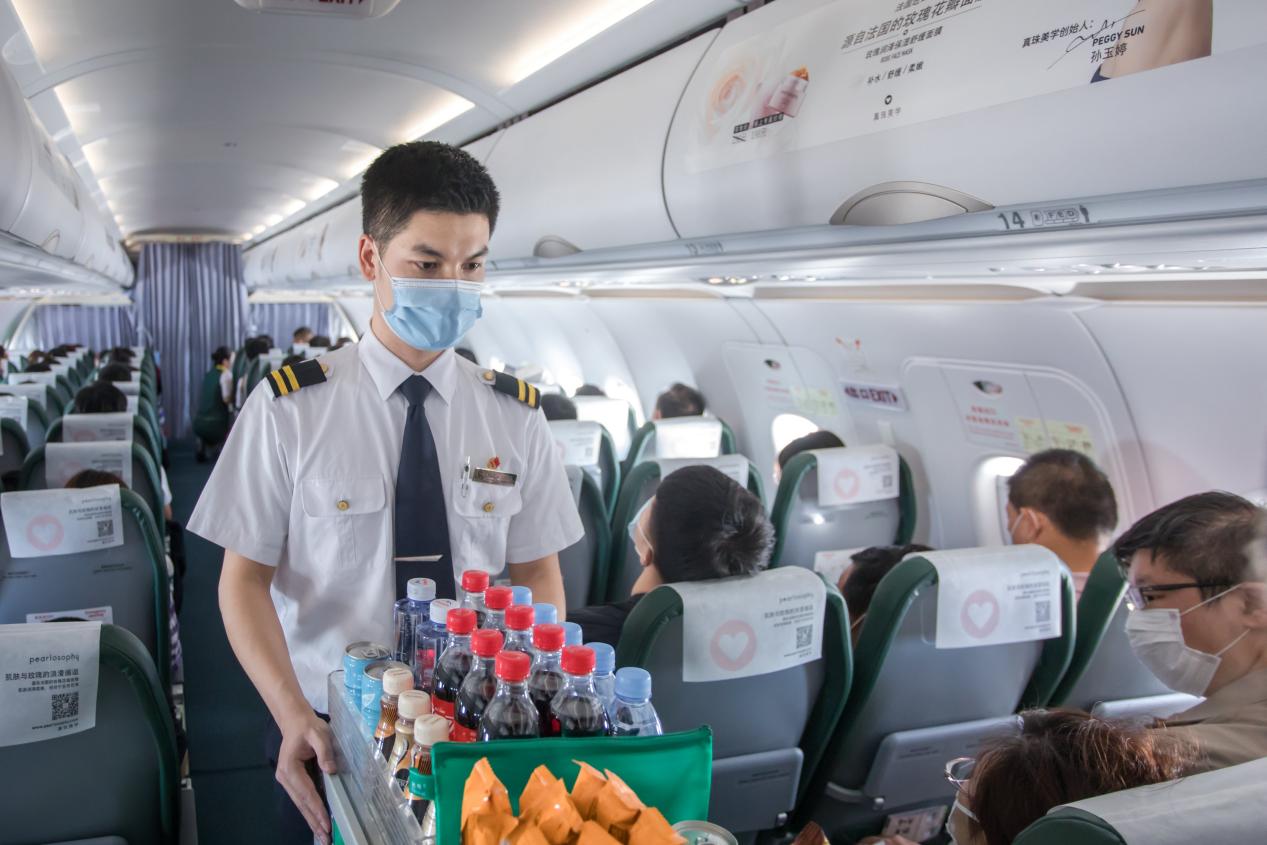 來自云南紅河綠春縣騎馬壩鄉的熊忠元執飛航班為乘客提供服務。圖片由上海市政府合作交流辦提供