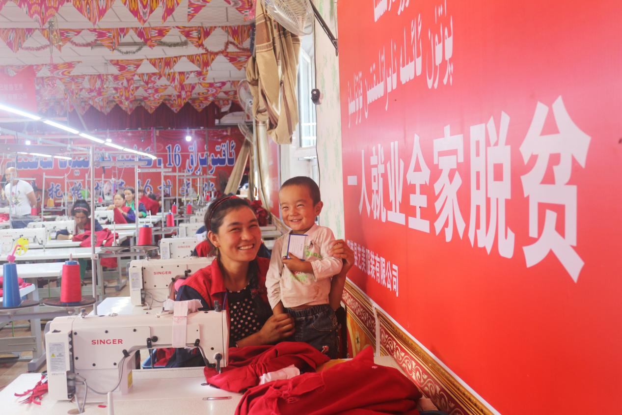 新疆喀什巴楚縣瓊庫爾恰克鄉農戶在家門口的“衛星工廠”上班。圖片由上海市政府合作交流辦提供