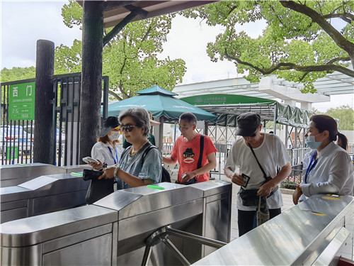 為保證免費開放后游客安全有序出行,上海共青森林公園嚴格執行預約入園二維碼和健康碼“兩碼”審核入園制度。為了方便老年游客順利入園,園方開放現場預約,安排志愿者協助游客入園,減少門口人員聚集。