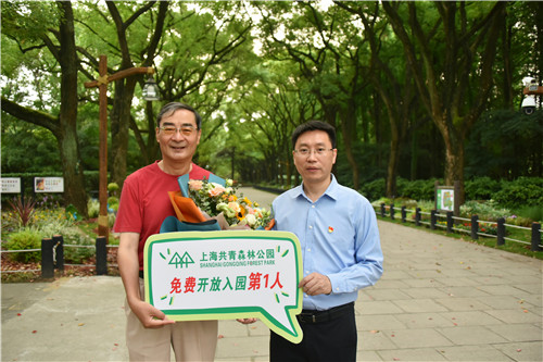 游客虞先生成免費開放入園第1人。上海共青森林公園供圖