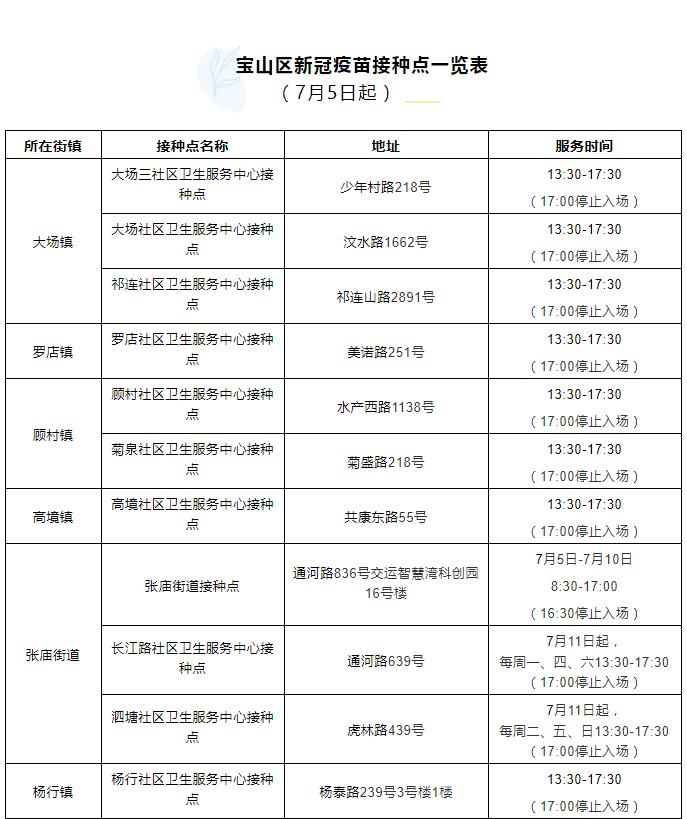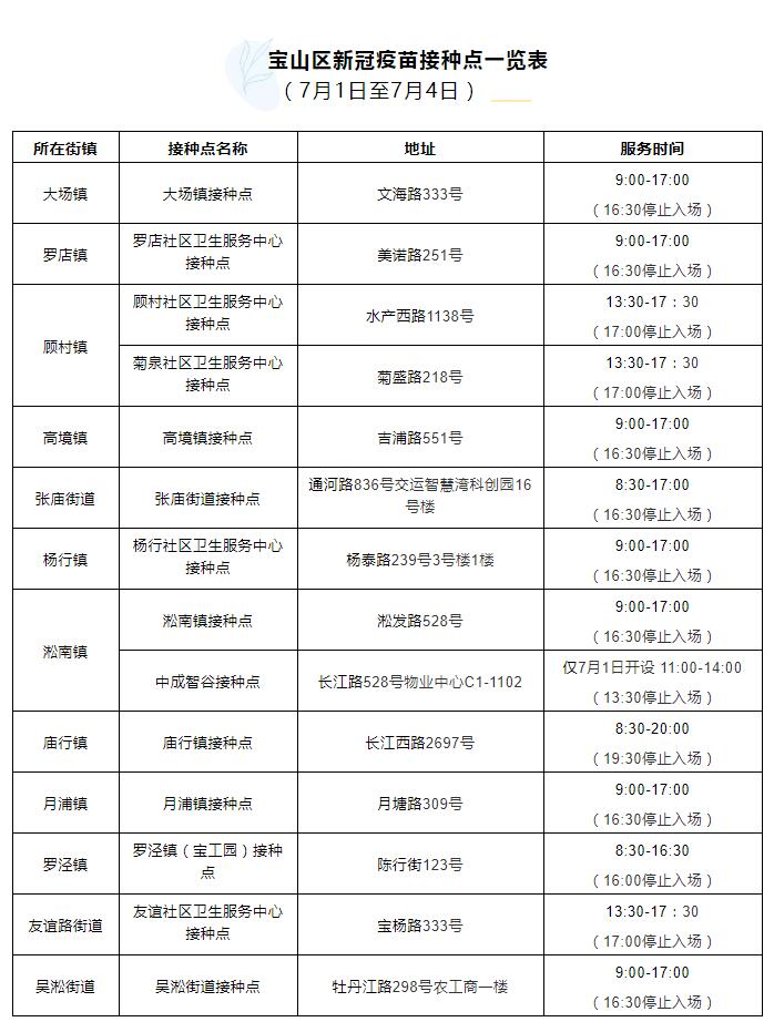 自7月1日起,寶山區新冠疫苗接種點調整,地址和服務時間見下表。市民可選擇就近接種。自7月5日起,請通過“健康云”平臺完成登記預約后前往。