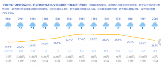 上海中心氣象臺2021年7月2日5點鐘發布今天和明天上海市天氣預報:陰有陣雨或雷雨,局部地區雨量可達中到大雨,明天多云到陰有分散性陣雨,明天的午后到夜里陰有陣雨或雷雨。東到東南風3-4級,明天轉南到西南風4-5級。今天最高溫度28度,明天最低溫度25度。