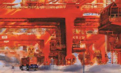 在“日出東方——上海市慶祝中國共產黨成立100周年美術作品展”上展出的作品《大國重器——洋山深水港》。 受訪方供圖