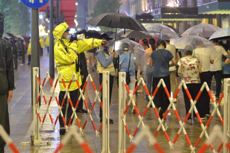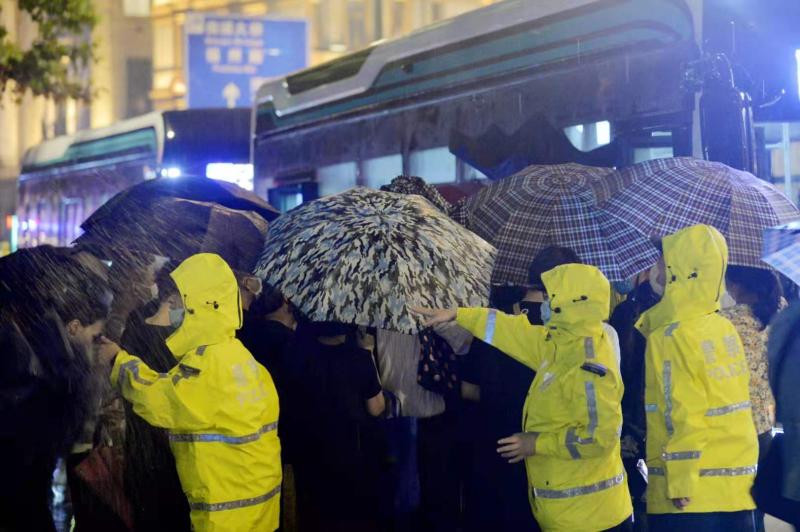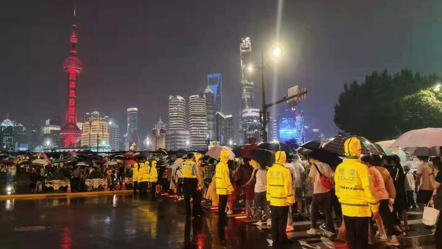 59萬市民游客冒雨前往外灘觀賞光影秀,公安民警雨中執勤保障安全、有序