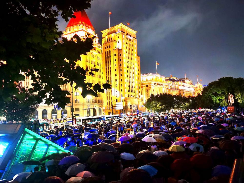7月3日大雨未能阻擋市民熱情,外灘親水平臺人流涌動