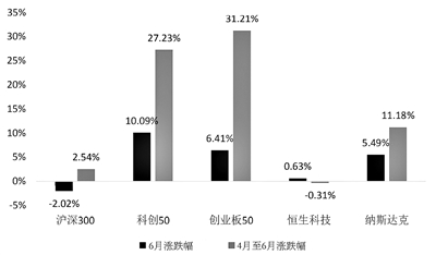 當天,創業板指漲0.55%,科創50指數漲2.45%。值得注意的是,匯集了一批國內優質科技創新企業的科創50指數今年以來漲勢明顯,截至7月5日收盤,該指數年內上漲13.13%,并于6月30日盤中升至1603.35點,創下年內新高。有機構指出,從上半年漲跌幅來看,科創50指數累計上漲14.01%,顯著優于除創業板指外的其他A股主要指數。其中,以白馬藍籌股為主的滬深300和上證50指數上半年分別上漲0.24%、下跌3.90%,市場風格切換態勢明確。