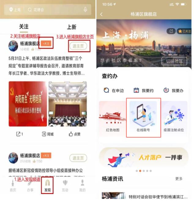 在“隨申辦”APP,點擊“發現”頻道,找到“楊浦區旗艦店”,進入區主頁,點擊“在線取號”。