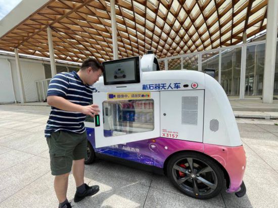 其中,由新石器與斑馬智行聯名推出的一款無人零售車,將在大會B館外的廣場實現自動巡邏售賣,F場工作人員介紹,看起來還不到一人高的“迷你”售貨車,卻實實在在有著“大肚量”,可以承載最高達500公斤的貨品,容量相當于2臺三開門冰箱。不少負責設備調試的工作人員已經迫不及待嘗鮮,提前體驗了無人零售車的便利——掃描二維碼,支付寶扣款,打開“車門”,就能取出冰爽的消暑飲料。大會期間,兩臺售貨車將在高峰時段循環運行。