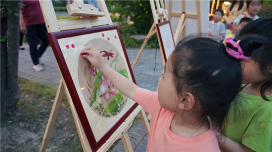 聽廉音,繪廉韻,品廉味。結合北淀浦河路環城水系公園的古文化特點,趙巷鎮新城一站大居在公園內設置了多處游園打卡點,在夜幕降臨時供來此休閑散步的居民和孩子打卡學習。傳統國學受歡迎,在漢禮老師的帶領下,孩子們誦讀廉潔名句,傳承廉潔家風,講述廉潔故事。詠蓮詩歌以親子共讀的形式,引導人們了解蓮廉同脈的同時,以蓮示廉、借蓮倡廉、賞蓮明廉、愛蓮守廉。涼亭周圍懸掛的蓮花燈,孩子們在認領、點亮的同時,也將美好的愿望寄托于上。