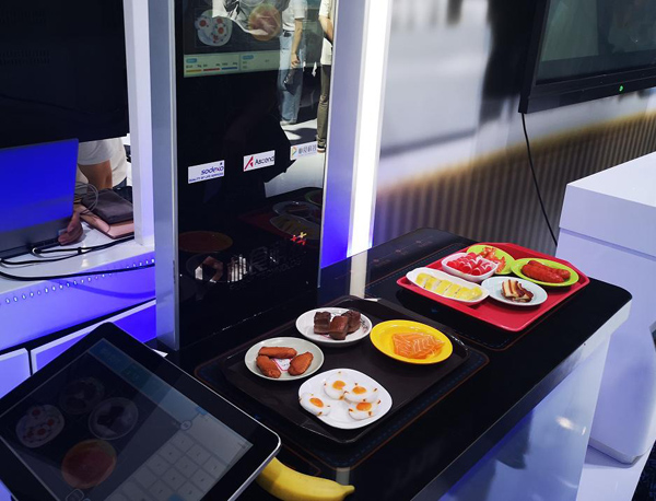 一份雞翅、一碟煎蛋、一份刺身、一份米飯……好,裝盤完畢。端著餐盤經過攝像頭時,機器快速識別菜品,屏幕上同步顯示出價格,還貼心地提供了食物的營養成分及熱量信息,再也不用擔心熱量攝入過多了。