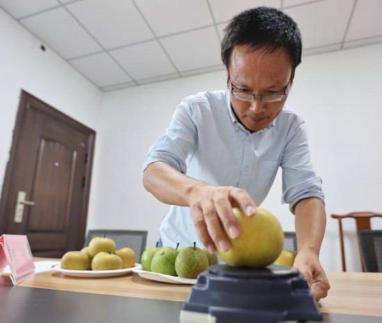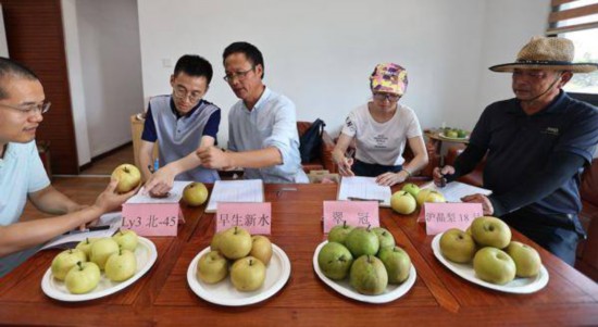 2021年7月8日,科研人員、市民代表在給早熟梨打分。當日,上海市本地早熟梨新品種“滬晶梨18號”品鑒會暨上市儀式在青浦區上?等晦r業專業合作社舉行。