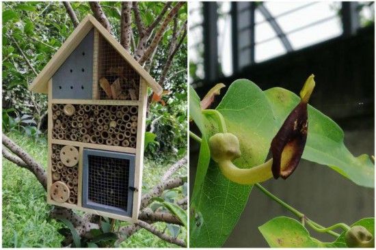 塞滿竹筒的蜂箱(圖左)和馬兜鈴,馬兜鈴是一些蝴蝶的寄主植物