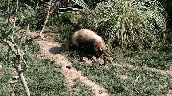 到了晚上,飼養員事先塞在石頭縫或埋在池塘邊淺土層里的狗糧、肉糜,誘使豬獾忙個不停。這些簡單的進食障礙,能對它們產生有益刺激,發展行為多樣性,避免刻板、不自然的表現。