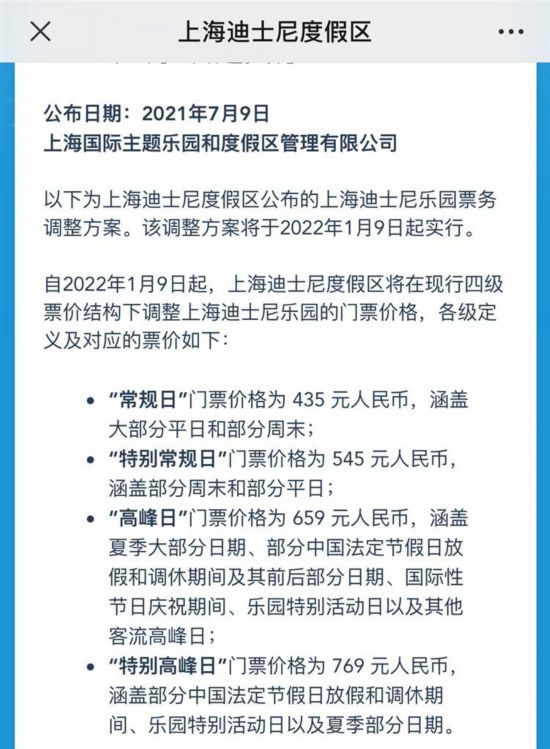 今天中午,上海迪士尼樂園官方網站公布了將于2022年1月9日起施行的新的票務方案。新方案將維持四級票價結構不變,從低到高為常規日、特別常規日、高峰日和特別高峰日,從明年1月起,每一級的價格將有小幅上漲,調整后的價格分別為435、545、659、769。