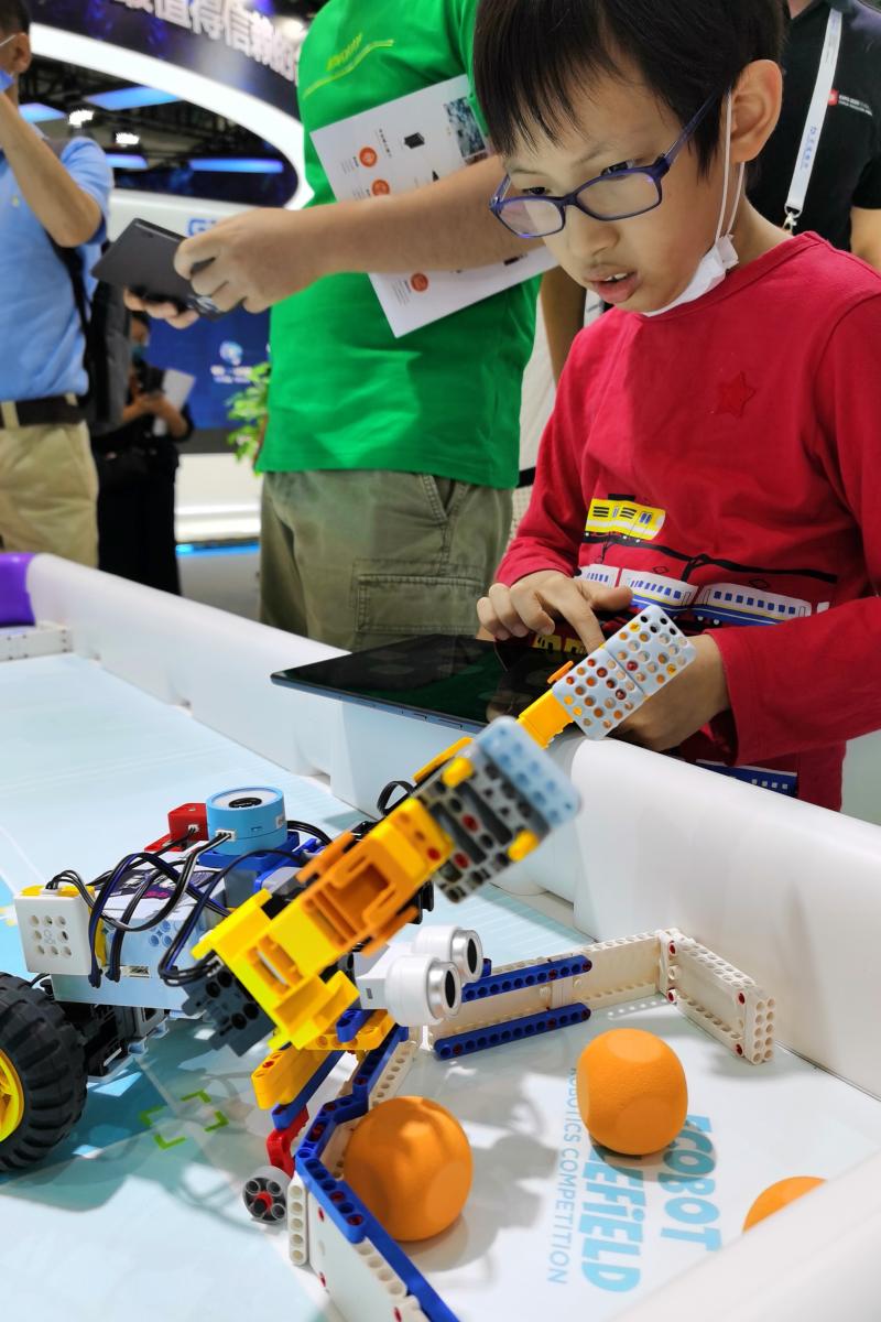 AI變革,教育先行,在“智能教育論壇”外,小觀眾在優必選科技展區參加教育機器人比賽
