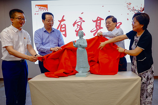 會上,上海市政協副主席金興明、市委統戰部常務副部長黃紅、市委宣傳部副部長、市文明辦主任潘敏、中共一大紀念館黨委書記、館長薛峰共同為主題捐贈作品——由中國陶藝泰斗周國楨教授創作的陶瓷雕塑“唱支山歌給黨聽”揭幕,并為藝術家頒發捐贈證書。