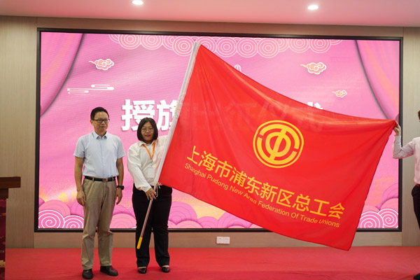 儀式現場,浦東新區總工會黨組副書記、副主席李幼林為即將出征第二屆國家級新區經開區高新區班組長管理技能大賽的浦東代表隊授旗。