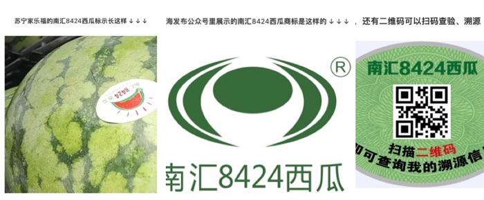 7月10日,上海市消保委發文點名蘇寧家樂福,就有吃瓜群眾向消保委反映,看到蘇寧家樂福有1.68元/斤的8424西瓜出售,但是,這些西瓜上貼著的8424西瓜標示與消費者在上海發布微信公眾號里看到的商標標示有些不一樣。
