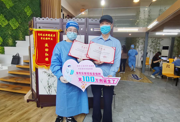 在王聆和黃雋怡們的努力下,5月13日中午,在百聯中環購物廣場接種點,出現了普陀區第100萬劑次的受種者。