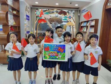 孩子們對這里的一切都充滿好奇。步入大堂,“武康大樓”的剪影佇立在眼前,走進“勞動者港灣”, 400余本書組成的書墻莊重肅穆。 “歡迎光臨書香港灣!贝蜷_書籍目錄冊,藍牙音箱同步發出了親切的聲音!凹热挥赀@么大,我們要不就在這里制作紅色主題小報吧?”一個孩子提議。