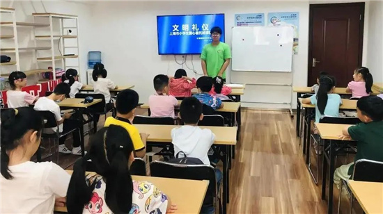 暑托班的第一天,由華東師范大學中共黨史專業和教育學專業研究生團隊,帶來的黨史主題課程——《中國共產黨誕生在上!,引導孩子們從小學黨史,傳承紅色基因。大學生志愿者陳駱駿,則為同學們上了一堂文明禮儀課。
