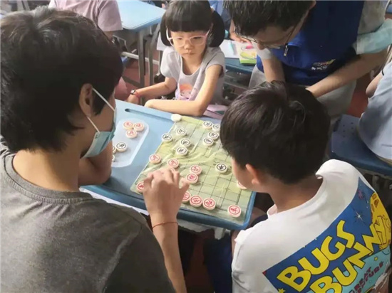 在折紙課上,志愿者老師教同學們如何疊出一只可以蹦蹦跳跳的小青蛙,動手制作手工讓同學們對這堂課充滿興趣;在中國象棋課上,老師借助生動有趣的故事,向同學們介紹了棋盤、棋子的基本知識,同學們兩兩一組,擺開棋盤對弈。