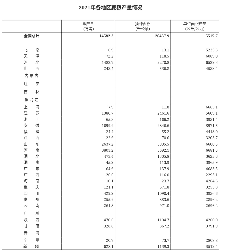 人民網北京7月14日電 (申佳平)據國家統計局官網今日消息,根據對全國25個夏糧生產。▍^、市)的調查,2021年全國夏糧播種面積26438千公頃(39657萬畝);全國夏糧單位面積產量5515.7公斤/公頃(367.7公斤/畝);全國夏糧總產量14582萬噸(2916億斤),比2020年增加296.7萬噸(59.3億斤),增長2.1%。對此,國家統計局農村司司長李鎖強表示,2021年夏糧播種面積恢復性增長,單產穩步提高,夏糧喜獲豐收。