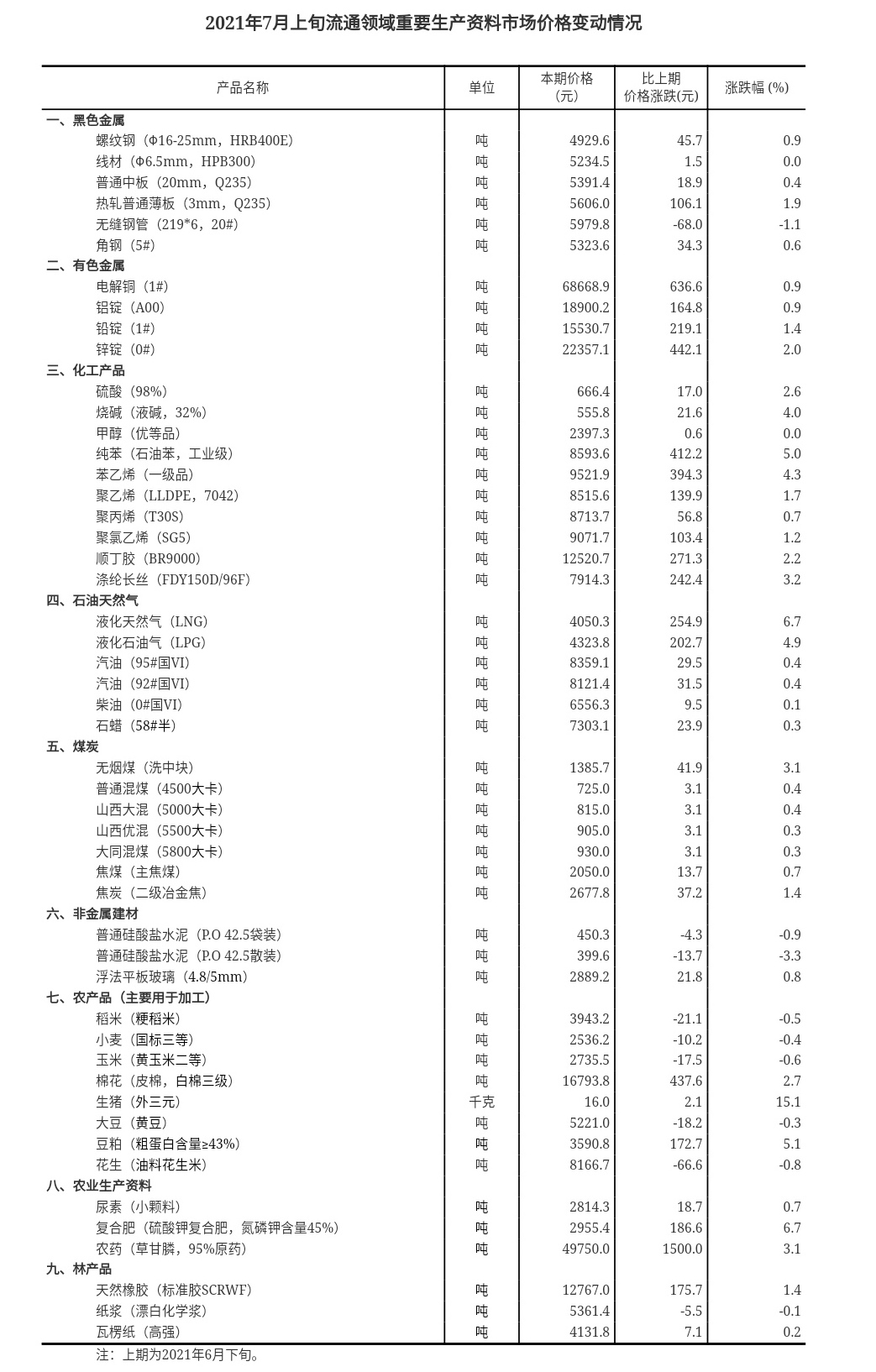 人民網北京7月14日電 (申佳平)據國家統計局官網消息,據對全國流通領域9大類50種重要生產資料市場價格的監測顯示,2021年7月上旬與6月下旬相比,39種產品價格上漲,9種下降,2種持平。