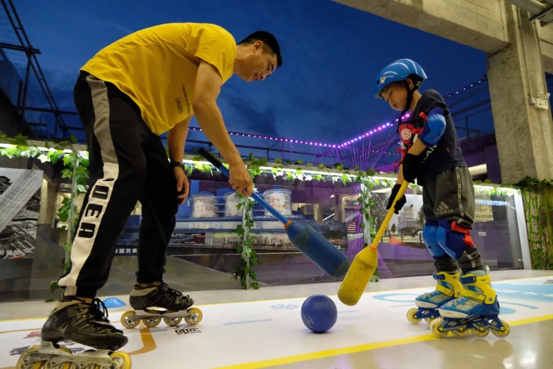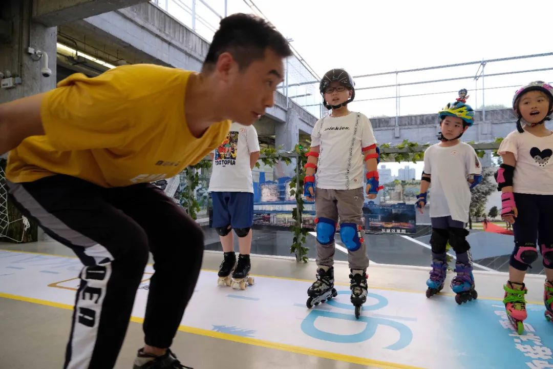 在露天區域,設有一個以冬奧會為主題的“空中滑道”。傍晚時分,一場輪滑體驗活動正在這里火熱舉行。