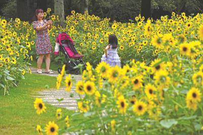 上海市黃浦區南園濱江綠地的公園里,市民倘佯在金色的向日葵花海里賞花拍照。