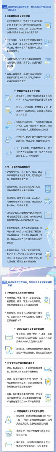 記者了解到,生活服務板塊,上海將大力發展醫療健康、養老服務產業,提升健康養老服務產業化水平,豐富智慧化、國際化、高品質服務供給;大力發展文化創意、教育培訓產業,提升服務質量;深化國際會展之都、世界著名旅游城市、全球著名體育城市建設,進一步提升會展旅體服務的輻射力和帶動力;推動商貿家政服務個性化、品質化發展,促進消費提質擴容。